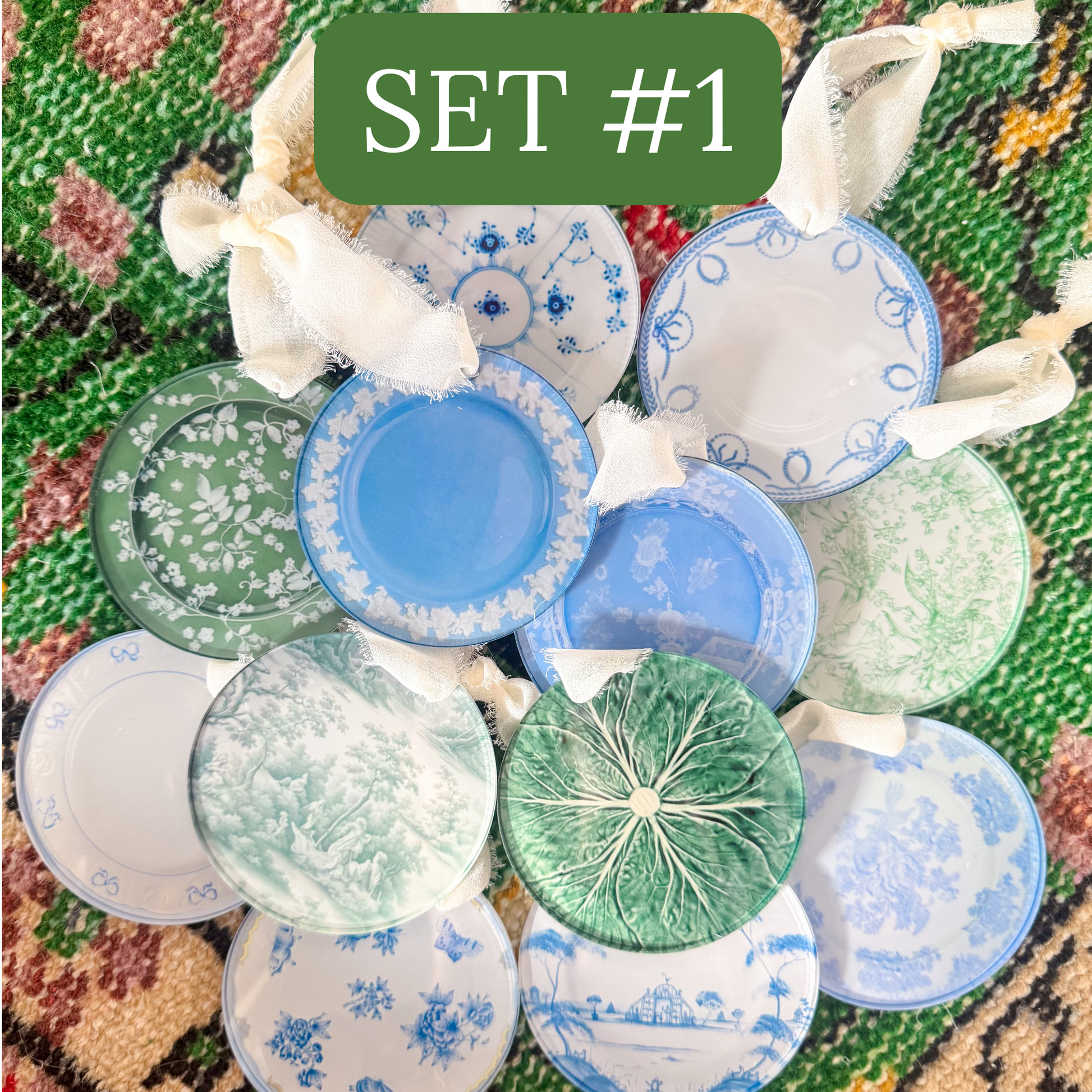 Available as a full set of 12 or in curated sets of 6, these 3-inch acrylic ornaments come finished with your choice of white or green chiffon ribbon—ready to bring charm to your tree, fireplace mantle, or holiday wreath.