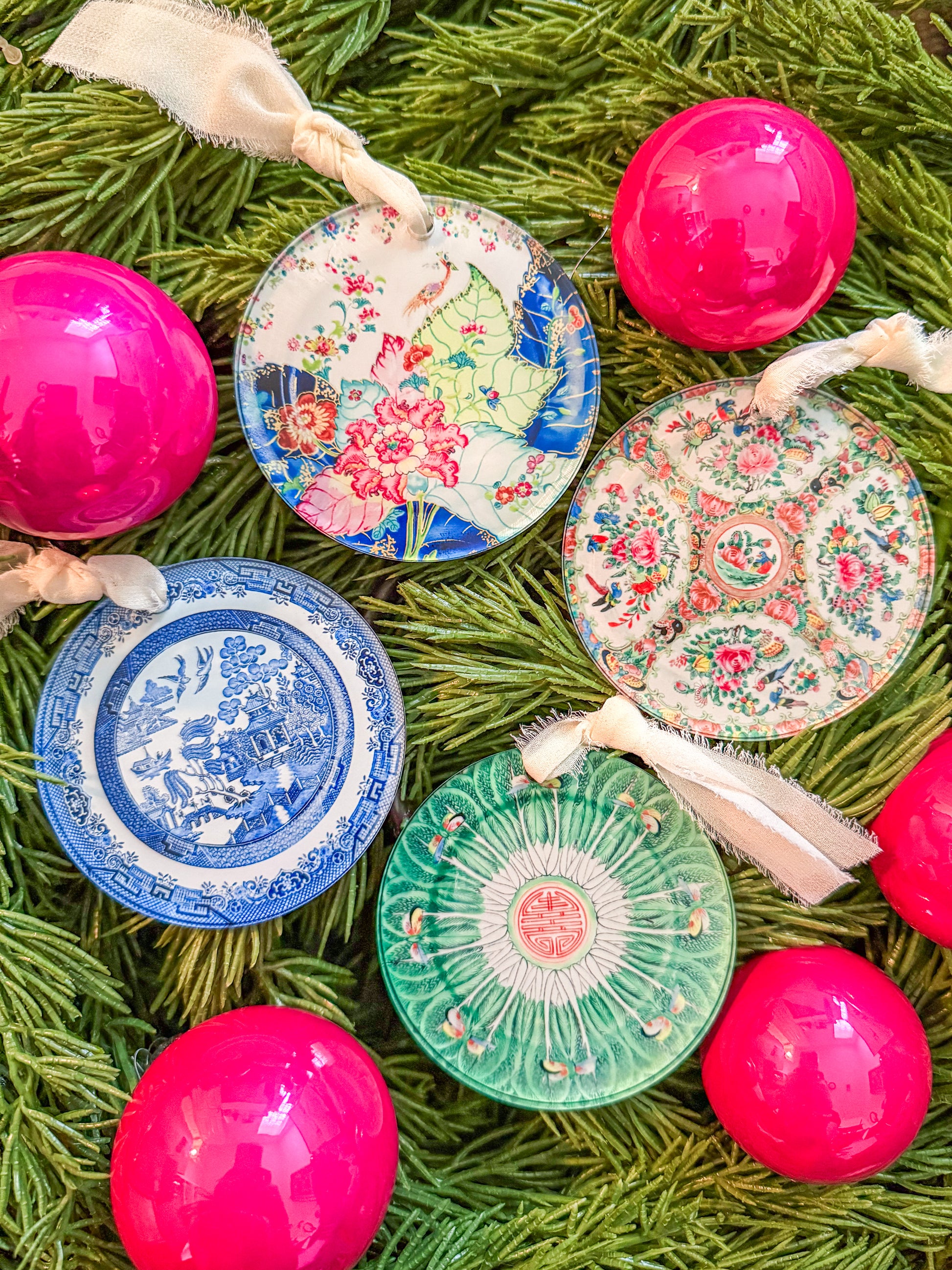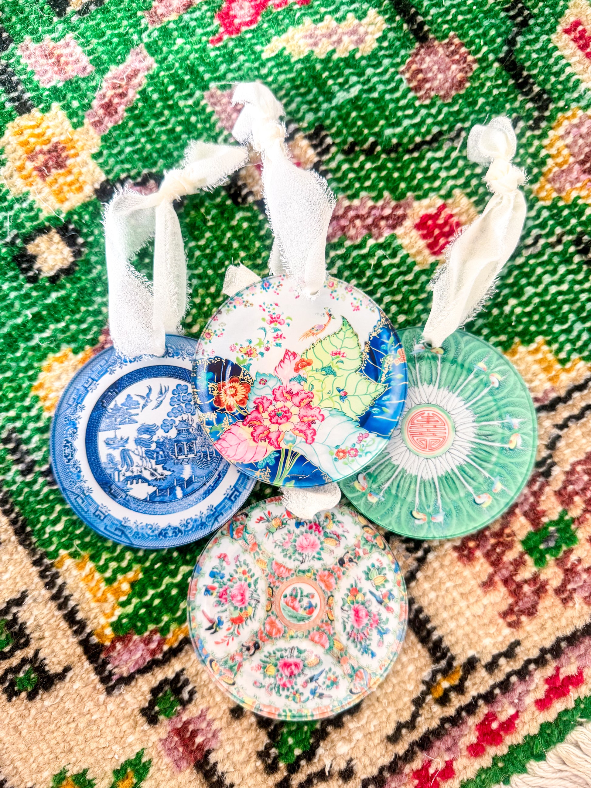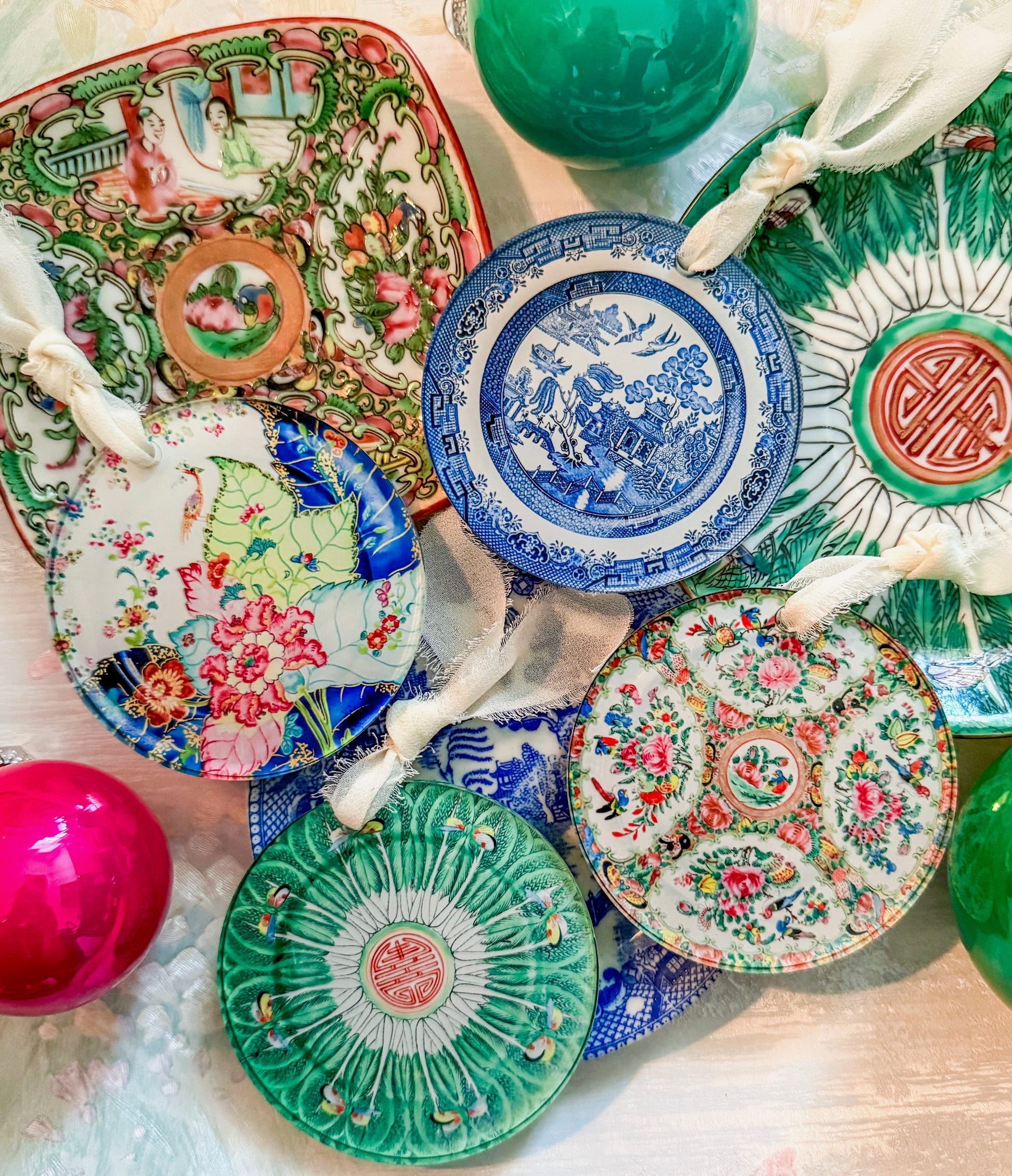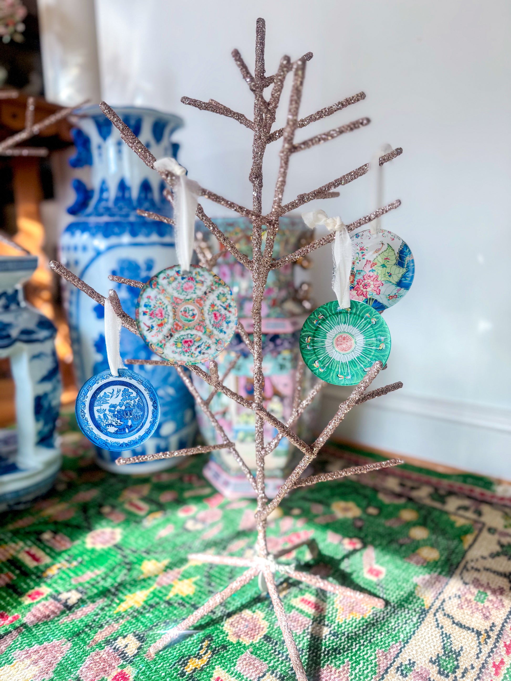 These ornaments are inspired by the plates that fill my china cabinet and plate wall. The patterns that bring light and joy into my home every day. Rose Canton, Blue Willow, Tobacco Leaf, and Bok Choy are timeless favorites that I treasure, and now they can sparkle on your tree, too. I hope they bring the same beauty and delight to your holiday season.