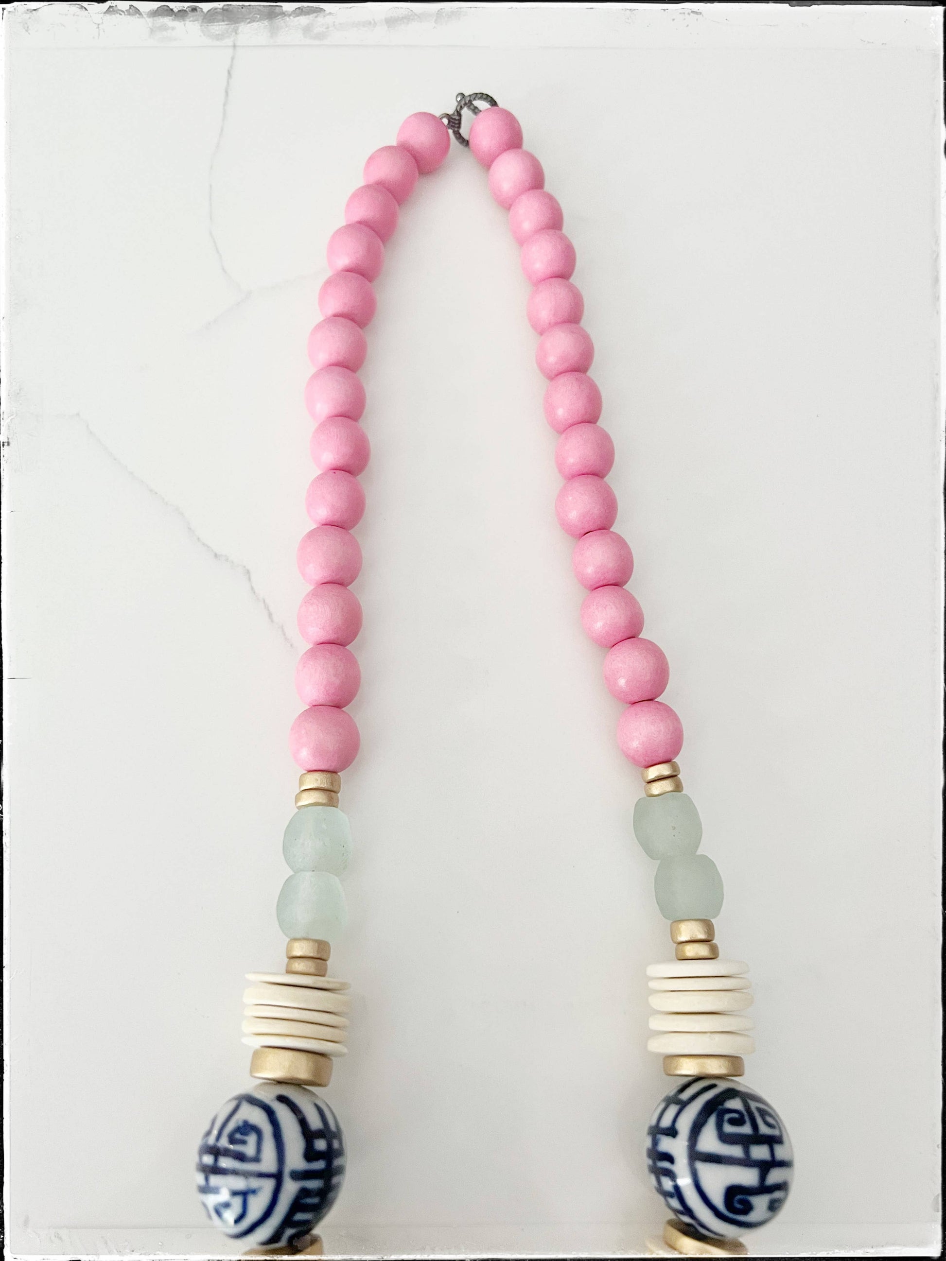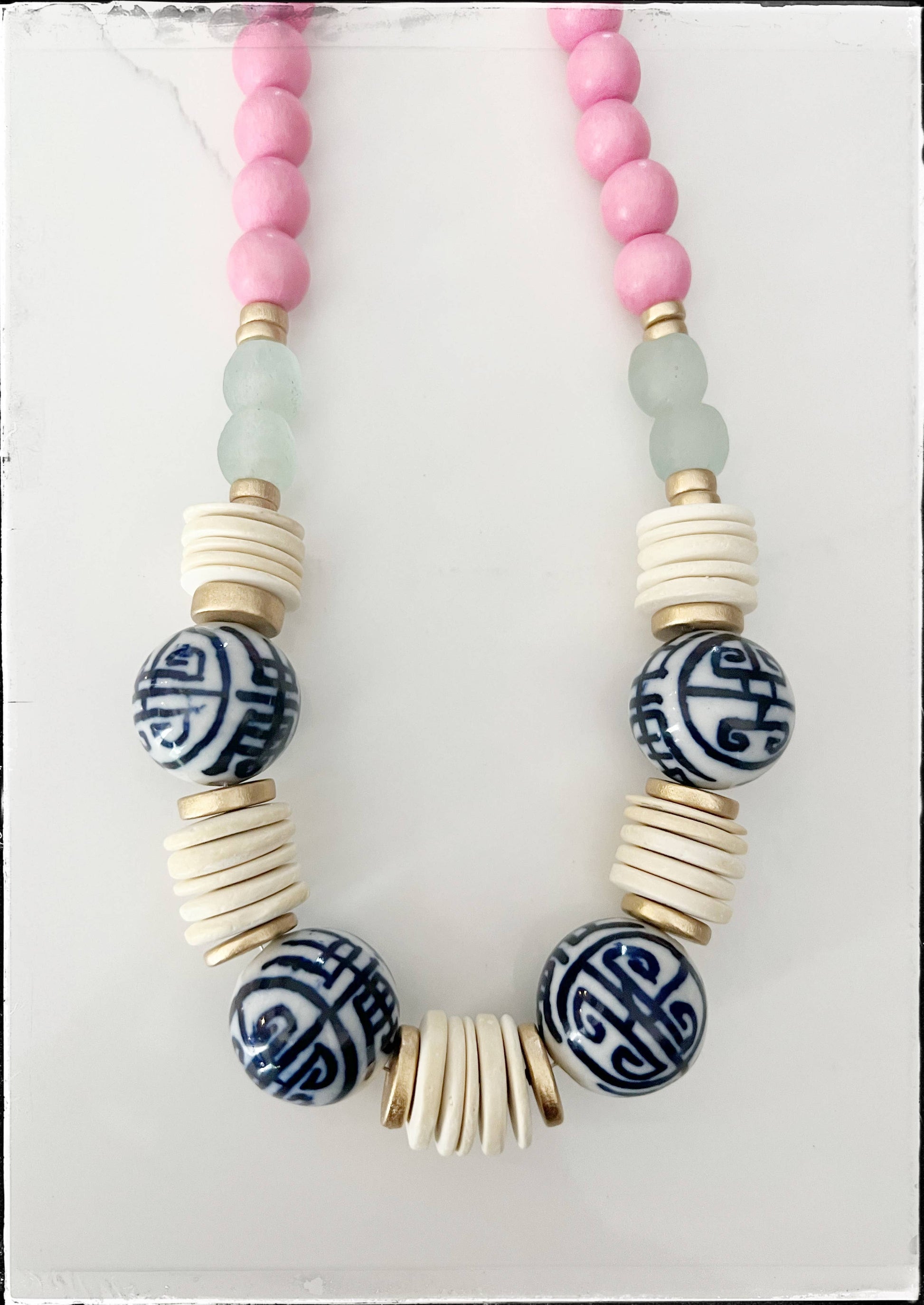Teal Recycled Glass Beads / Long Statement Necklace / White Clay polymer Disk Bead / Chinoiserie Bead / Wood Bead Layering Necklace